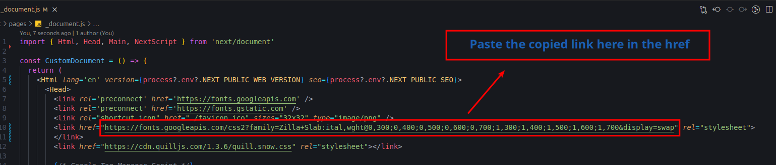 - Open src/pages/_document.js file and paste the link here as shown in below image